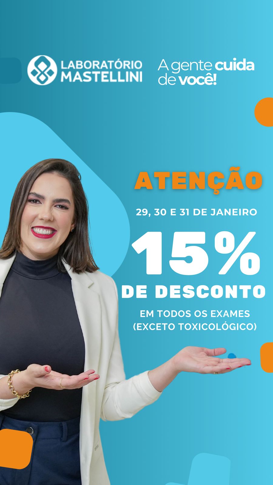 A unidade de Adamantina, que está situada na rua Osvaldo Cruz, 109, está com desconto diferenciado neste final de mês. Até a próxima quarta-feira (31), o Laboratório Mastellini oferece um desconto exclusivo de 15% em todos os exames, com exceção o toxicológico.
