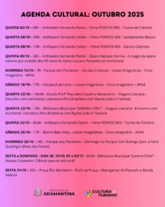 A Prefeitura de Adamantina anunciou nesta terça-feira (30) a programação cultural do mês de outubro. O calendário contempla diversas atrações gratuitas, com música, cinema, literatura, circo e ciência, voltadas a diferentes públicos da cidade.