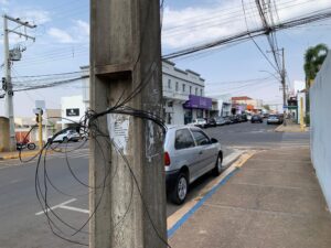 Seja na região central ou nos bairros, é comum observar cabos inutilizados, que, além de causarem poluição visual, representam risco de acidentes. Situações semelhantes já resultaram em tragédias, como o caso registrado em Goiás, na última semana, quando três pessoas morreram após choque elétrico em fios soltos.