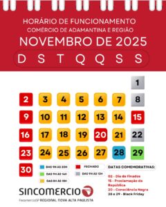 O Sincomercio Nova Alta Paulista (Sindicato Patronal do Comércio Varejista) divulgou, nesta terça-feira (28), o calendário de funcionamento do comércio de Adamantina para o mês de novembro, que contará com três feriados e a tradicional data de promoções da Black Friday.