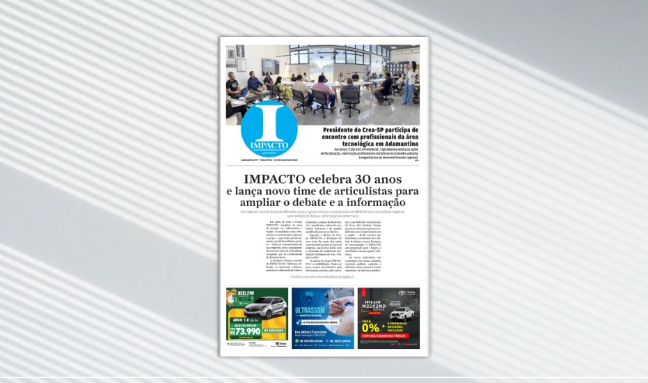 Jornal IMPACTO – edição de 24 de outubro de 2025 IMPACTO celebra 30 anos e lança novo time de articulistas para ampliar o debate e a informação 24/10/2025 08:59 Por Da redação Compartilhado FacebookTwitterWhatsApp Conteúdo anteriorFAI firma parceria com a Receita Federal e implanta o Núcleo de Apoio Contábil e FiscalPróximo conteúdoOperação Recon frustra plano de atentado contra autoridades na região de Presidente Prudente Publicidade