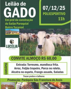 A Paróquia São Francisco de Assis, de Adamantina, promove no dia 7 de dezembro, a partir das 11h, um Leilão de Gado e almoço beneficentes em prol da construção do Salão Paroquial do Bairro Tucuruvi. O evento será realizado no recinto poliesportivo do município.