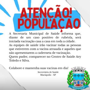 A Secretaria Municipal de Saúde de Mariápolis iniciou uma ação emergencial de vacinação contra a rubéola em toda a cidade, após a confirmação de um caso positivo da doença. A medida preventiva visa evitar a disseminação do vírus, que é altamente contagioso.