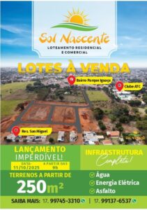 No próximo dia 11 de outubro, a partir das 9h, será lançado oficialmente o Loteamento Residencial e Comercial Sol Nascente, um novo espaço planejado para quem busca qualidade de vida e investimento seguro, em Adamantina.