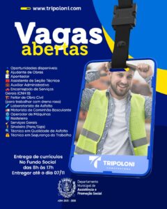 A Tripoloni Construtora, em parceria com o Departamento Municipal de Assistência e Promoção Social, está com diversas oportunidades de emprego abertas em Parapuã. As vagas são para diferentes áreas e níveis de qualificação, oferecendo uma chance para quem busca inserção ou recolocação no mercado de trabalho.