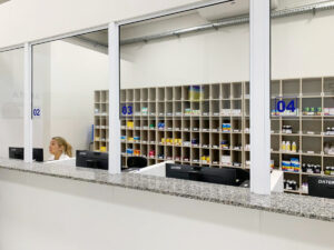 Com 630 m², a nova estrutura foi projetada para ampliar a capacidade de atendimento e oferecer mais acolhimento. O espaço conta com recepção e sala de espera climatizadas, balcões de dispensação com fluxos independentes, sala exclusiva para atendimento farmacêutico, estoque estruturado segundo normas sanitárias e áreas administrativas completas.