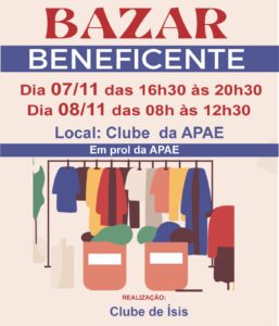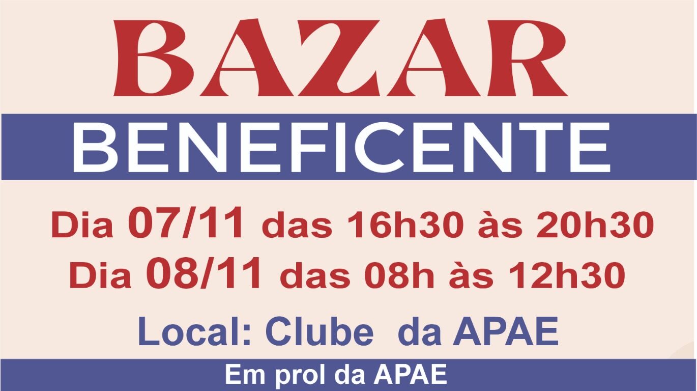 O bazar será aberto ao público em dois períodos: na sexta-feira, das 16h30 às 20h30, e no sábado, das 8h às 12h30. A iniciativa oferece uma variedade de produtos a preços acessíveis, e parte da renda arrecadada será destinada à manutenção das atividades e projetos da Apae, que presta atendimento a pessoas com deficiência no município.