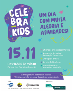 As atividades acontecem das 16h30 às 19h30, com participação gratuita e aberta ao público. “Além de promover o divertimento, o Celebra Kids vai ao encontro dos princípios do Sicoob Nosso, que há 37 anos promove o desenvolvimento sustentável da comunidade em que estamos inseridos, fortalecendo a alegria e a confraternização entre as famílias”, destaca a cooperativa de crédito.