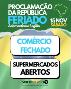 Neste sábado (15), feriado da Proclamação da República, o comércio de Adamantina permanecerá fechado, conforme determina a CCT (Convenção Coletiva de Trabalho) vigente. A informação foi confirmada pelo Sincomercio Nova Alta Paulista (Sindicato do Comércio Varejista).