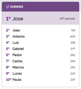 O estudo revela que, entre os mais de 140 mil nomes próprios registrados no país, Maria e José mantêm a liderança nacional, posição já apontada na edição anterior do levantamento, baseada no Censo 2010.