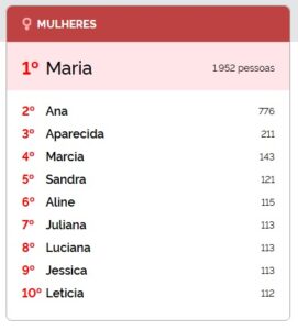 O estudo revela que, entre os mais de 140 mil nomes próprios registrados no país, Maria e José mantêm a liderança nacional, posição já apontada na edição anterior do levantamento, baseada no Censo 2010.