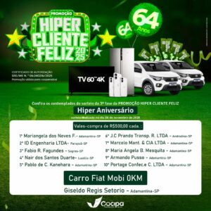 A Cocipa (Cooperativa de Consumo de Inúbia Paulista) realizou neste sábado (8) o terceiro sorteio da campanha Hiper Cliente Feliz 2025, que premiou cooperados com um Fiat Mobi 0km e 10 vales-compras de R$ 500.