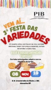 A Primeira Igreja Batista de Adamantina promove neste sábado, 8, a partir das 19 horas, a III Festa das Variedades, evento que acontece defronte à sede da Igreja, localizada na alameda Dr. Armando de Salles Oliveira, 360. A programação tem como objetivo arrecadar fundos para as obras de reforma do prédio da Igreja.