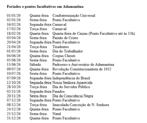 O ano de 2026 apresenta uma grande concentração de feriados em dias úteis. De acordo com o calendário oficial do município, Adamantina contará com 16 dias de descanso e 8 pontos facultativos, sendo que apenas o aniversário da cidade, no dia 13 de junho, acontecerá em uma data de fim de semana (sábado). O cenário sugere planejamento prévio do comércio varejista.