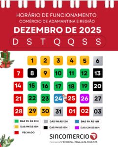 Com a proximidade das festas de fim de ano, o comércio de Adamantina terá expediente ampliado. De 10 a 12, de 15 a 19 e nos dias 22 e 23 de dezembro, as lojas abrirão das 9h às 22h.