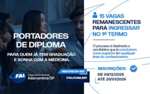 Estão disponíveis 15 vagas remanescentes, voltadas exclusivamente a candidatos que já concluíram curso superior em qualquer área do conhecimento e buscam a oportunidade de iniciar uma nova trajetória acadêmica na Medicina.