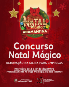 A Prefeitura de Adamantina abre nesta terça-feira (2) as inscrições para o Concurso Natal Mágico 2025, iniciativa da Secretaria de Desenvolvimento Econômico que busca fomentar o comércio local e estimular novos negócios. Os interessados podem participar por meio de formulário eletrônico ou presencialmente no Paço Municipal. O prazo se encerra no dia 10 de dezembro.