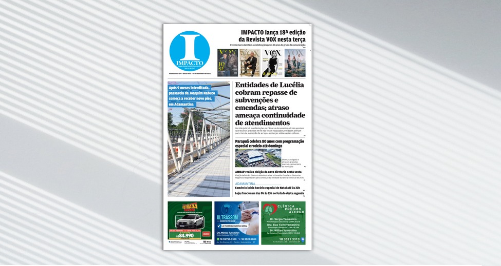 Jornal IMPACTO – edição de 5 de dezembro de 2025 Entidades de Lucélia cobram repasse de subvenções e emendas; atraso ameaça continuidade de atendimentos 05/12/2025 08:02 Por Da redação Compartilhado FacebookTwitterWhatsApp Conteúdo anteriorTV TEM inicia operação de transmissor em Adamantina e amplia cobertura regionalPróximo conteúdoEdição do “Calendário da Vida 2026” destaca mulheres que transformaram a história Publicidade