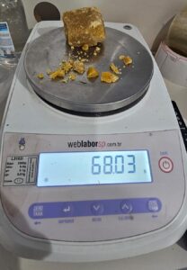Dentro da bolsa, os policiais encontraram uma pedra bruta de crack. Em buscas complementares na casa, também foram apreendidos R$ 847 em dinheiro, uma balança de precisão e um aparelho celular. No total, 68 gramas de crack foram recolhidos.