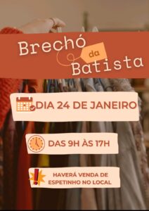 A Primeira Igreja Batista de Adamantina promove neste sábado, 24 de janeiro, o “Brechó da Batista”, um evento que une solidariedade, confraternização e boas oportunidades. A ação será realizada das 9h às 17 horas, na sede da igreja, localizada na alameda Dr. Armando de Salles Oliveira, 360.