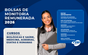 O Centro Universitário de Adamantina (FAI), por meio da Pró-Reitoria de Ensino (PROENS), abriu as inscrições do processo seletivo para o preenchimento de 30 Bolsas de Monitoria remuneradas, destinadas a estudantes regularmente matriculados nos cursos de graduação.