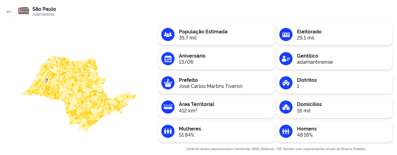 Sobre Adamantina, a ferramenta aponta uma população estimada de 35,7 mil habitantes, distribuídos em uma área territorial de 412 km². O município contabiliza 16 mil domicílios.