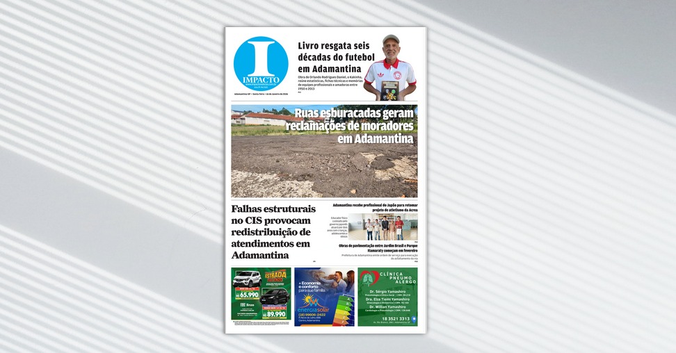 Jornal IMPACTO – edição de 16 de janeiro de 2026 Falhas estruturais no CIS provocam redistribuição de atendimentos em Adamantina 16/01/2026 11:54 Por Da redação Compartilhado FacebookTwitterWhatsApp Conteúdo anteriorPrazo de regularização termina e novas regras para veículos ciclomotores entram em vigorPróximo conteúdoSindicato protocola pedido e Prefeitura de Adamantina anuncia recontagem de tempo de serviço dos servidores Publicidade