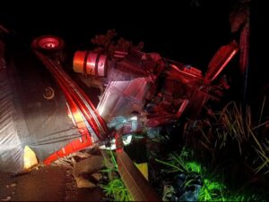 Na sequência, um segundo caminhão, com semirreboque, que seguia no mesmo sentido e transportava pisos de concreto, atingiu a roda que estava na pista. Com o impacto, o motorista perdeu o controle da direção e colidiu frontalmente com um automóvel que trafegava no sentido contrário.