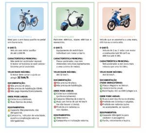 Para os ciclomotores, as exigências são as mesmas de uma moto comum: capacete para condutor e passageiro, retrovisores, faróis e proibição expressa de circular em ciclovias ou calçadas.