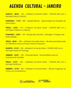 Encerrando a agenda do mês, no dia 27 de janeiro, às 14h, será exibida a animação Minhocas no Anfiteatro Fernando Paloni. Já no dia 31 de janeiro, às 20h, o mesmo espaço recebe o espetáculo Mundo Imaginário de Chrly, com a Cia Multiverso, finalizando as atividades culturais de janeiro em Adamantina.