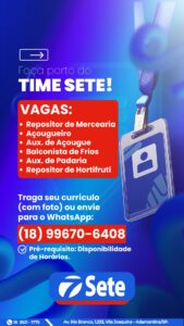 A Rede Sete de Supermercados está com processo seletivo aberto para o preenchimento de vagas de emprego em Adamantina.