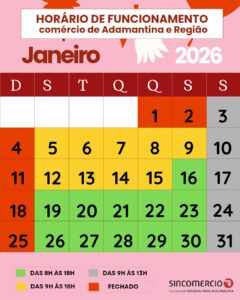 O Sincomercio Nova Alta Paulista (Sindicato do Comércio Varejista de Adamantina e Região) divulgou os horários de funcionamento do comércio de Adamantina para o mês de janeiro. As mudanças ocorrem em razão da compensação pelo período de funcionamento estendido registrado em dezembro, durante as vendas de Natal.
