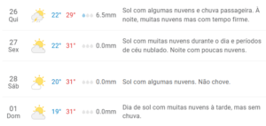 Na sexta-feira (27), o tempo tende a se estabilizar, e não há previsão de chuva. A mesma condição deve se manter no sábado (28) e no domingo (1º), garantindo um fim de semana de tempo firme na cidade.