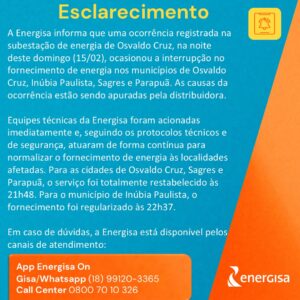 De acordo com nota oficial da Energisa, o problema afetou as cidades de Osvaldo Cruz, Inúbia Paulista, Sagres e Parapuã.