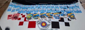 Na sequência, os policiais foram acionados por uma testemunha que informou que um casal havia deixado em sua residência uma mochila contendo diversos produtos, alegando que retornaria posteriormente para buscá-la. Desconfiada, a moradora acionou a Polícia Militar, que recolheu o material.