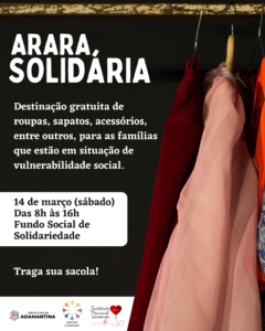 A Prefeitura de Adamantina realiza neste sábado (14), das 8h às 16h, mais uma edição da “Arara Solidária”, iniciativa voltada à doação gratuita de roupas, sapatos e acessórios para famílias em situação de vulnerabilidade social.