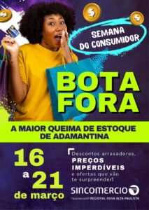 O comércio de Adamantina realiza a partir da próxima segunda-feira (16) a campanha promocional ‘Bota Fora’. A iniciativa, organizada pelo Sincomercio Nova Alta Paulista, se estende até o sábado (21) e oferece descontos com o objetivo de impulsionar as vendas e liquidar os estoques da coleção de verão.