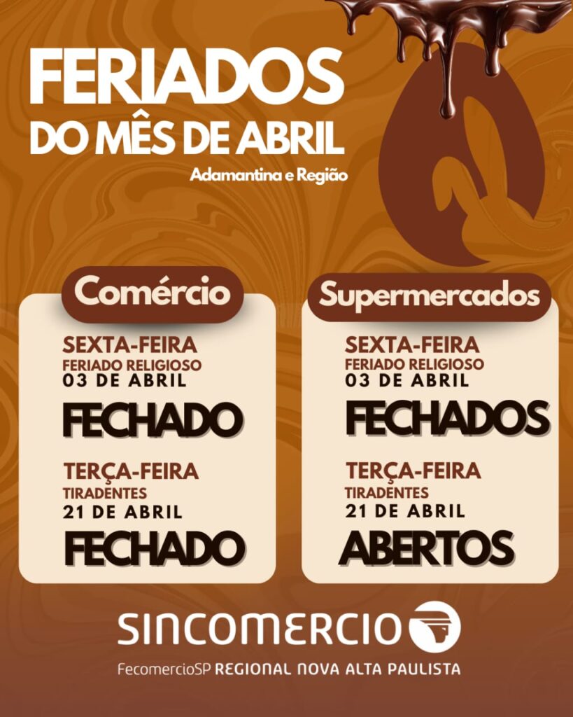 O Sincomercio (Sindicato do Comércio Varejista) Nova Alta Paulista divulgou o esquema de funcionamento do comércio e dos supermercados em Adamantina e região para os feriados do mês de abril. As regras definem o que abre e o que fecha na Sexta-Feira Santa e no dia de Tiradentes.