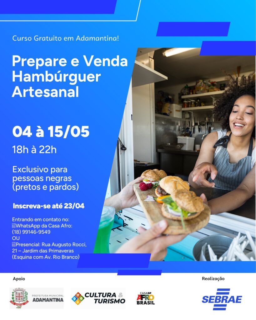 O Sebrae, em parceria com a Casa SP Afro Brasil de Adamantina, está com inscrições abertas para um curso gratuito de preparo e comercialização de hambúrguer artesanal, voltado exclusivamente a pessoas negras (pretos e pardos). A iniciativa busca fomentar o afroempreendedorismo, incentivando a geração de renda, autonomia e novas oportunidades de negócio.