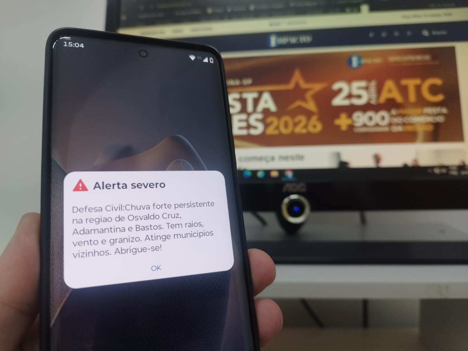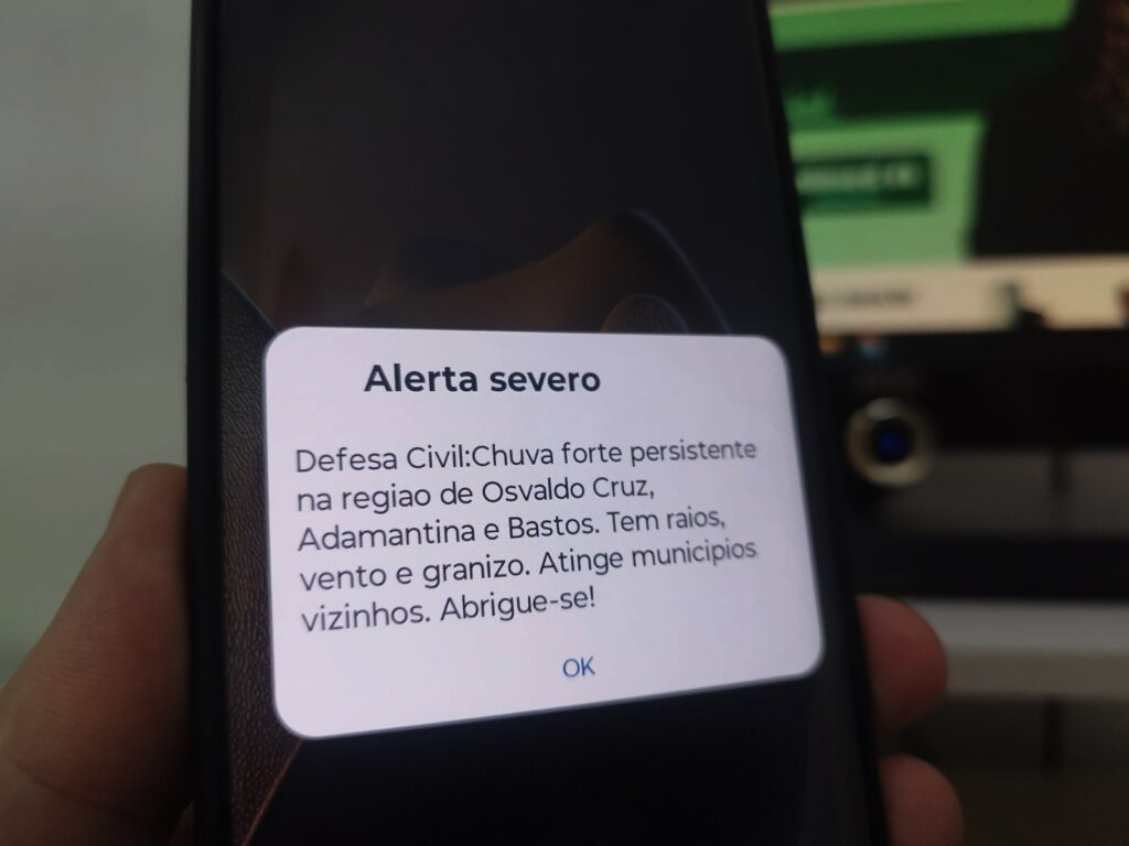 A mensagem, classificada como “alerta severo”, apareceu nos celulares por volta das 15h, acompanhada de som agudo e vibração. No texto, a Defesa Civil informou: “Chuva forte persistente na região de Osvaldo Cruz, Adamantina e Bastos. Há raios, vento e granizo. Atinge municípios vizinhos. Abrigue-se”.