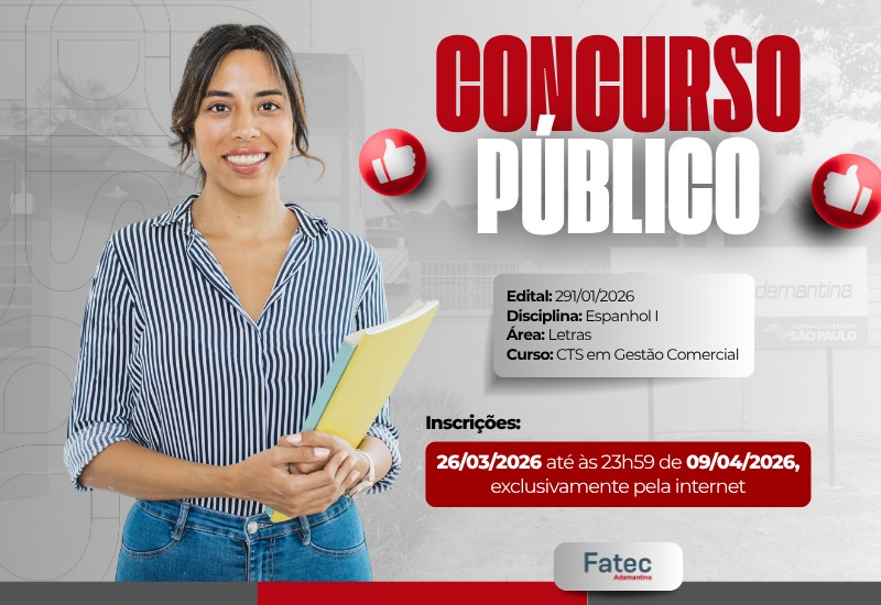O Centro Paula Souza (CPS) abriu nesta quinta-feira, 26, o período de inscrições para concursos públicos visando à contratação de docentes para três disciplinas de cursos tecnológicos de Ensino Superior da Faculdade de Tecnologia (Fatec) de Adamantina.