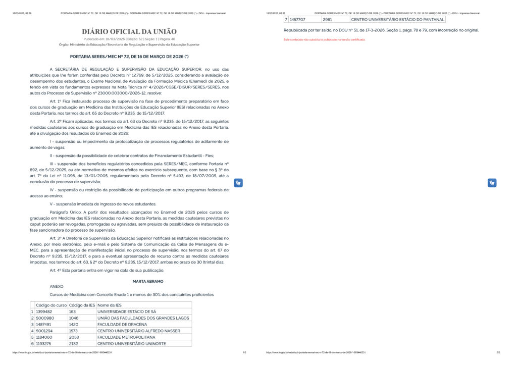 O MEC (Ministério da Educação) corrigiu um erro e retirou a FAI (Centro Universitário de Adamantina) da lista de instituições sob supervisão por baixo desempenho no Enamed 2025 (Exame Nacional de Avaliação da Formação Médica). A retificação foi publicada nesta quarta-feira (18) no Diário Oficial da União.