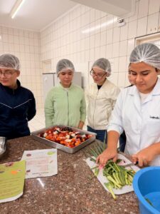 Para consolidar o aprendizado, a segunda etapa ocorreu no Laboratório de Técnica e Dietética da FAI. Os alunos do ensino fundamental foram recebidos para uma oficina prática onde puderam “colocar a mão na massa”. Sob supervisão, eles aprenderam a preparar opções mais saudáveis, como nuggets e molho de tomate. Ao final, a turma participou da degustação das próprias receitas, unindo o viés lúdico à educação nutricional.