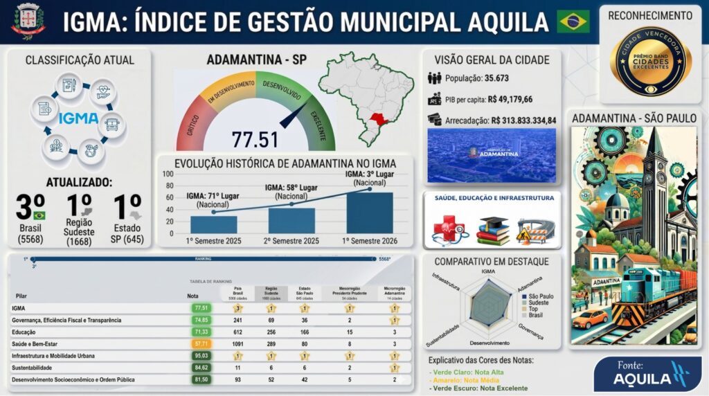 Por fim, a administração municipal destacou que “a evolução de Adamantina no IGMA demonstra a efetividade de uma gestão orientada por dados, metas e resultados”, acrescentando que o desempenho “posiciona o município como referência nacional em governança pública e desenvolvimento sustentável”.