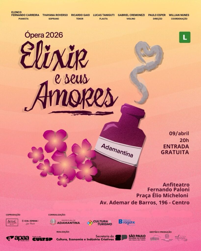 Adamantina recebe no próximo dia 9 de abril uma apresentação especial da ópera “O Elixir e Seus Amores”, ampliando a programação cultural do município com um espetáculo gratuito aberto à população.