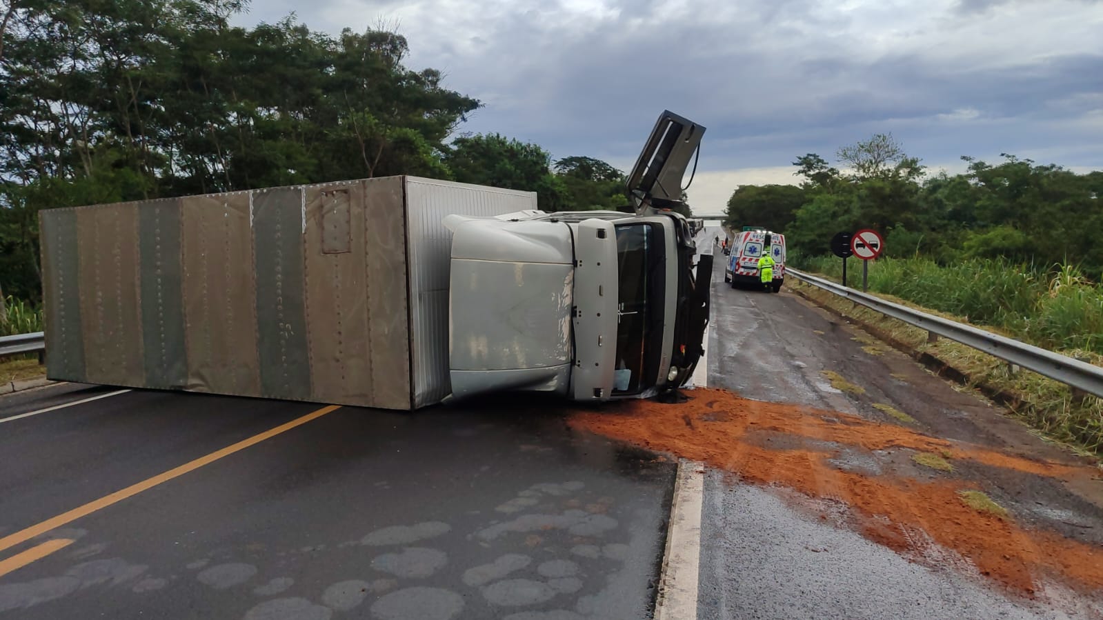 O caminhão ficou atravessado entre as faixas leste e oeste, bloqueando totalmente a rodovia. O motorista, que estava sozinho, sofreu ferimentos leves nas pernas, no rosto e no abdômen. Ele foi atendido no local por uma ambulância e encaminhado ao pronto-socorro para avaliação médica.
