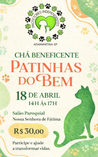 O grupo Protetores Independentes de Adamantina realiza no dia 18 de abril, das 14h às 17h, o “Chá Beneficente Patinhas do Bem”. O evento acontecerá no Salão Paroquial Nossa Senhora de Fátima, em Adamantina, com o objetivo de arrecadar fundos para o pagamento de dívidas veterinárias e para a manutenção de uma casa de passagem voltada a gatos resgatados de situações de abandono e maus-tratos.