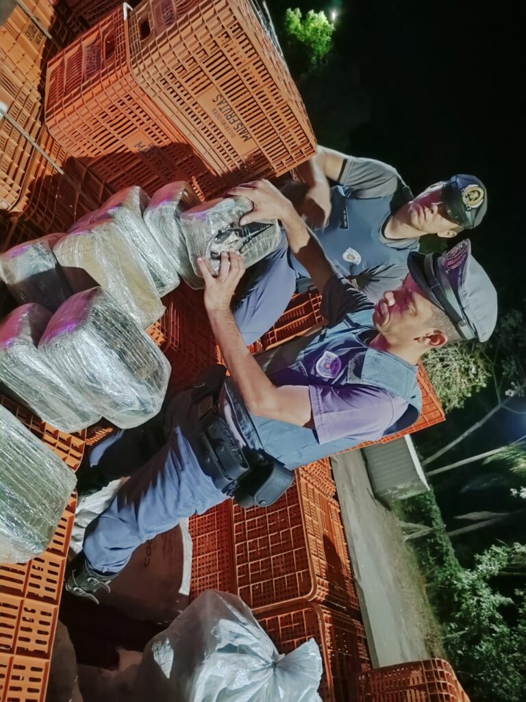 Durante a entrevista, o motorista apresentou nervosismo e deu respostas desconexas, o que levantou suspeitas da equipe. Na vistoria do compartimento de carga, os policiais localizaram cinco fardos de maconha, totalizando 135,188 quilos da droga, distribuídos em 126 tabletes escondidos entre as caixas.
