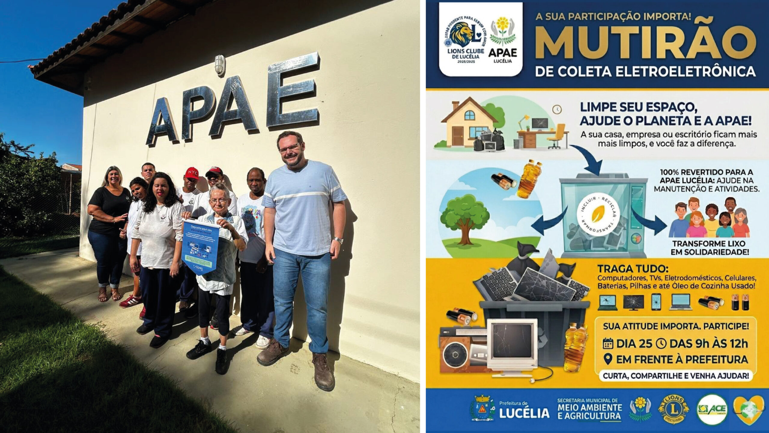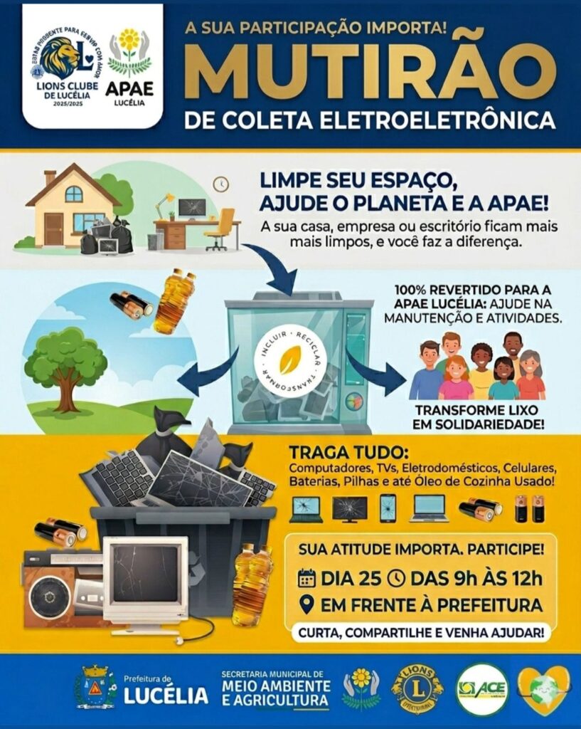 Além da destinação ambientalmente adequada, o evento também possui caráter solidário. Todo o material arrecadado será revertido para a APAE de Lucélia, contribuindo com a manutenção de suas atividades e o atendimento à população.