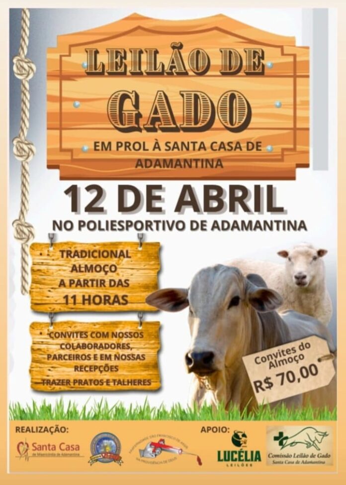 A Santa Casa de Adamantina na Providência de Deus promove neste domingo (12), a partir das 11h, seu tradicional leilão de gado beneficente no recinto poliesportivo da cidade. O evento solidário reúne a comunidade com o objetivo de arrecadar recursos fundamentais para a manutenção e a continuidade dos atendimentos prestados pela instituição hospitalar.